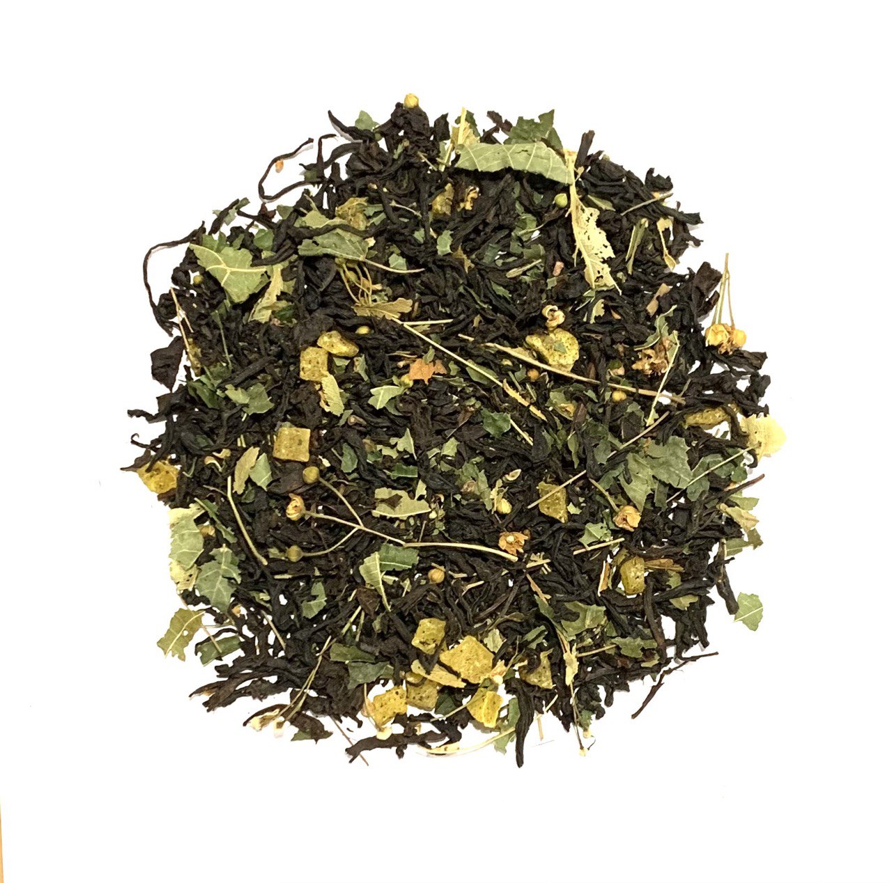 Черный чай Индия, цветы и листья липы, кусочки ананаса, медовые гранулы.