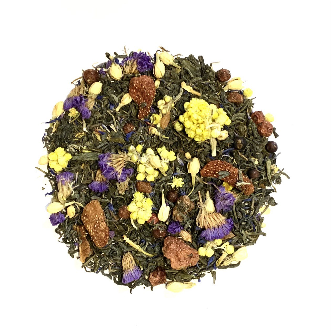 Зеленый чай с жасмином, бессмертником, васильком, можжевельником, смородиной и клубникой.