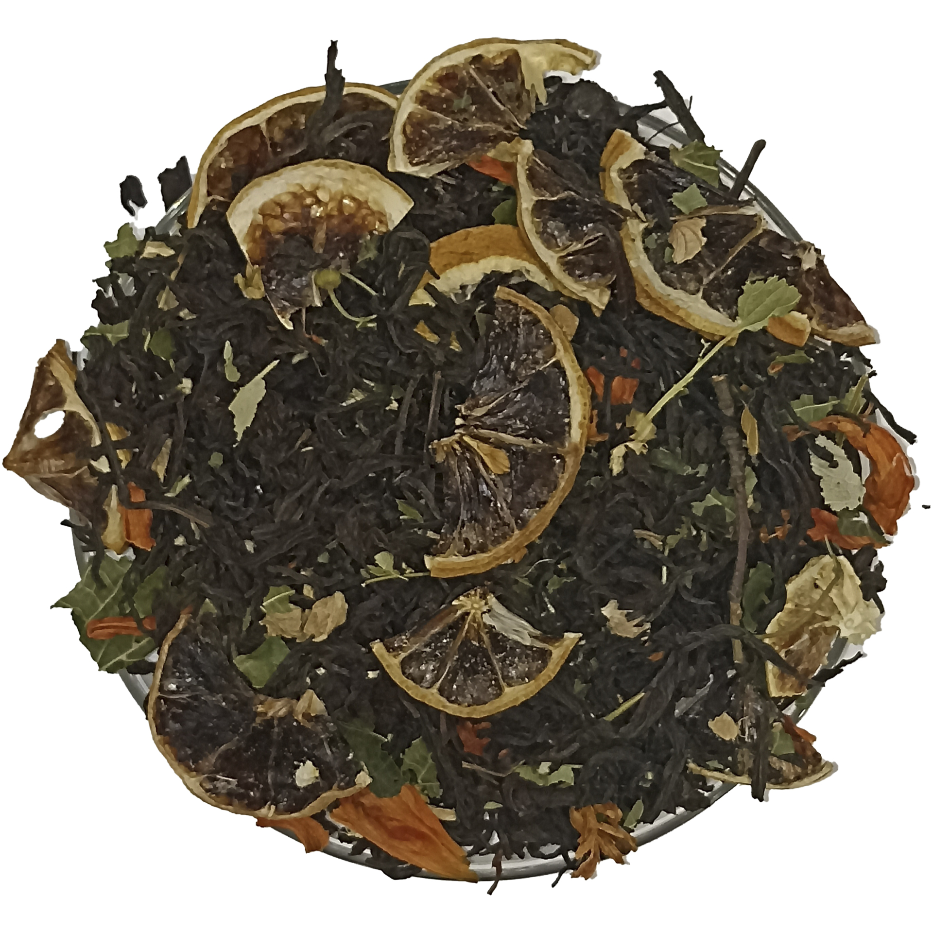 Индийский чёрный чай, ананас цукат, клубника ягода, василёк лепестки, календула лепестки