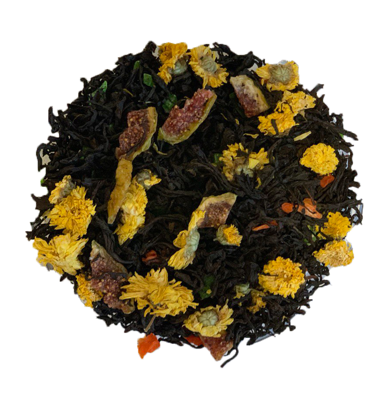 Контрастный купаж с чипсами инжира и ароматом фейхоа.Индийский чёрный чай, инжир чипсы, ананас цукат, морковь, хризантема снежная