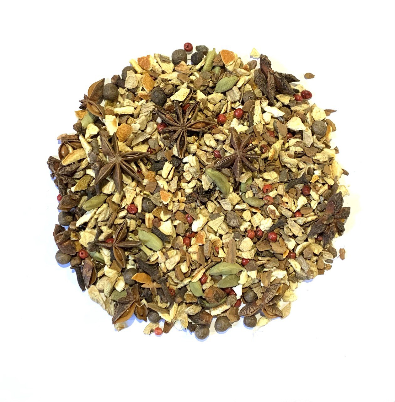 Состав: Корица, имбирь, бадьян, апельсин цедра, гвоздика, перец душистый, кардамон, розовый перец, анис